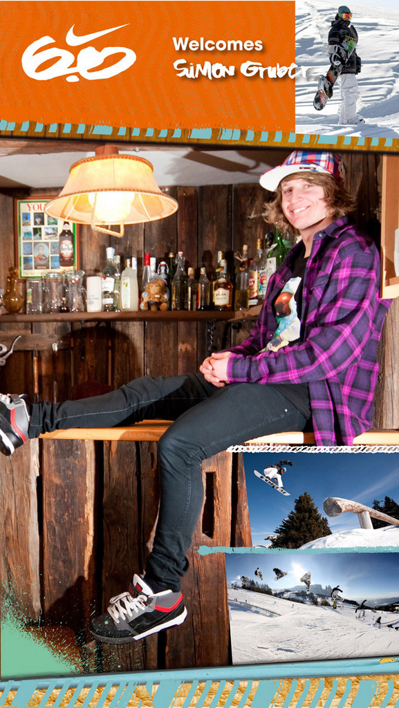 Nike 6.0 è orgogliosa di annunciare la new entry del team: Simon Gruber, uno dei maggiori talenti dello snowboard in Italia. Che dire di lui? E’ sicuramente il miglior rider presente nel panorama italiano: quando entra in scena lui, l’attenzione si sposta e l’ammirazione sale. Per raccontare il personaggio a chi ancora non lo conoscesse, lasciamo la parola agli ultimi successi ottenuti da Simon: nel 2008, primo al “Red Bull Snow Palio” e alla Iuter “War of Generations”; quarto al “Garden of Roses” e terzo al “Burton Stomp It” a Skipass.
